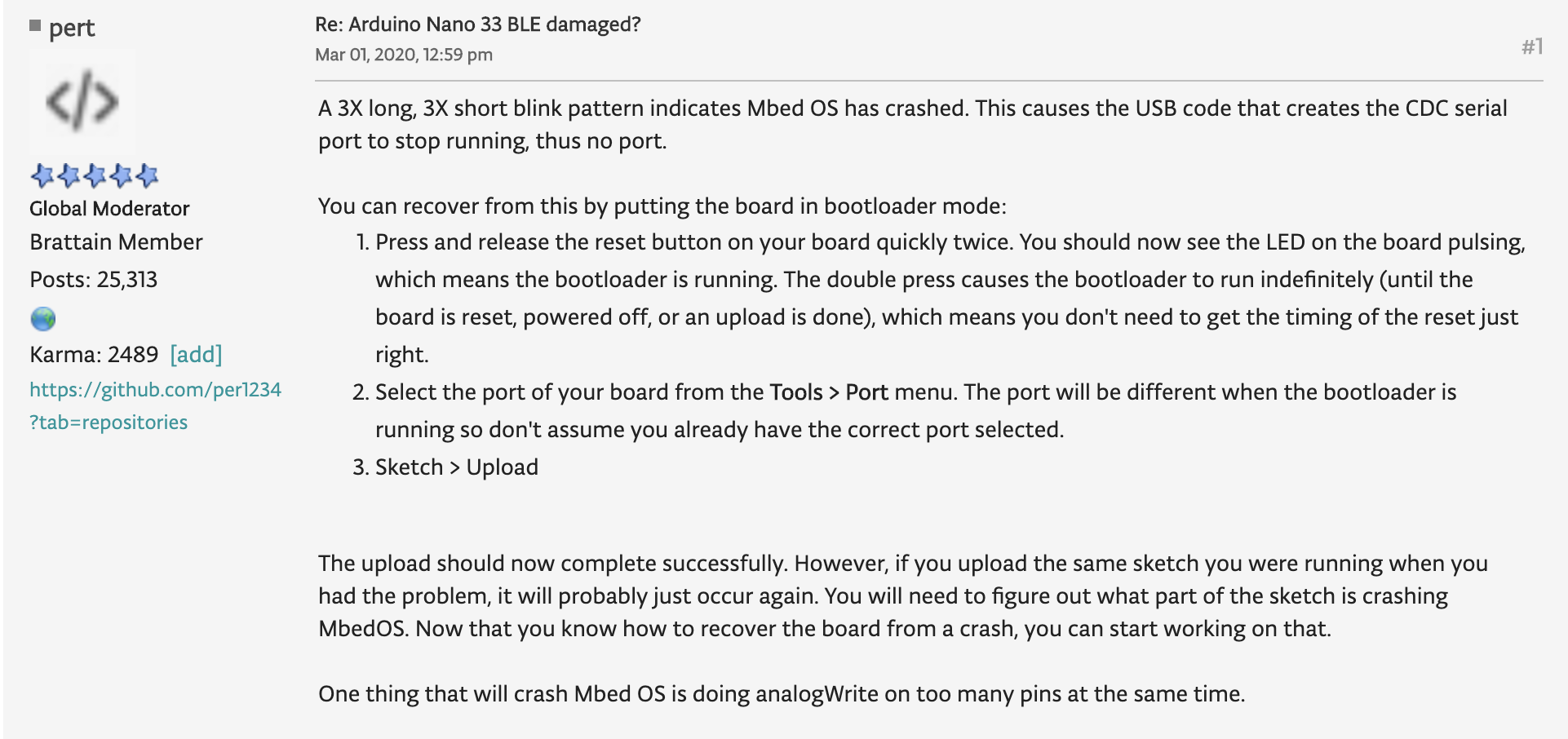 Hey guys, I uploaded a code on my Nano 33 BLE and after that nothing happend expect the orange led (programmable led) started blinking in a rythm. In Addition my compter won't recognize the seriell port of the arduino anymore. Ideas what happend? Thanks fo