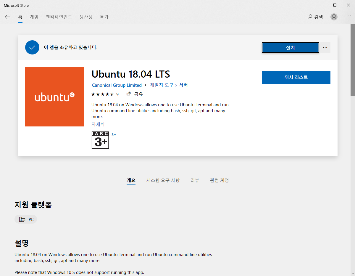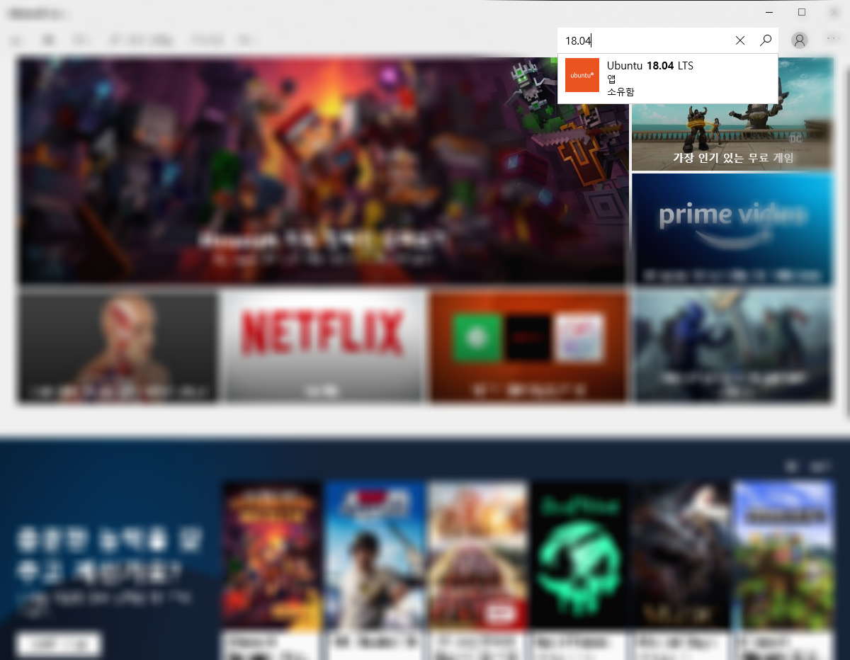 재부팅 후 Microsoft Store에 들어가 18.04를 검색한다